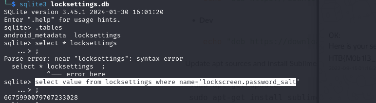 Next, we need the salt from locksettings.db. We can achieve this by using sqlite3 with the following command: