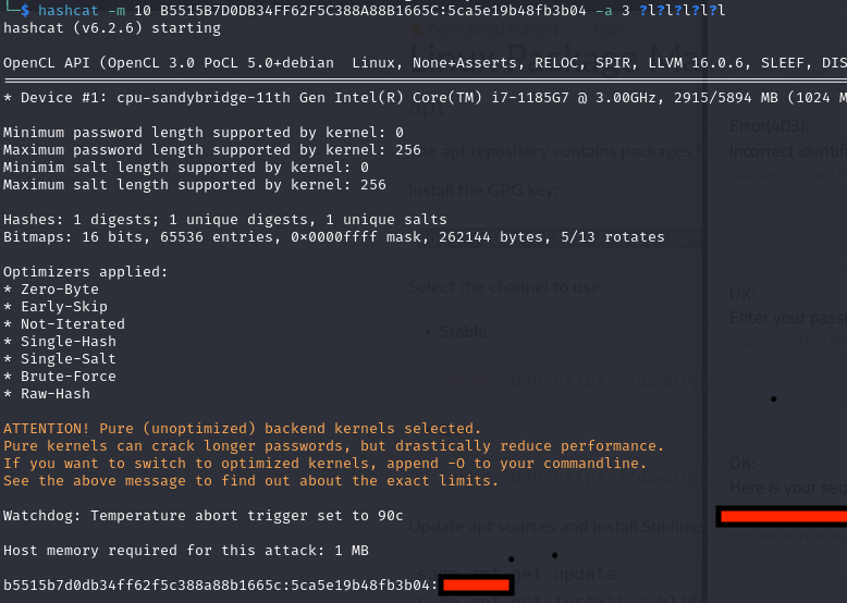 hashcat -m 10 B5515B7D0DB34FF62F5C388A88B1665C:5ca5e19b48fb3b04 -a 3 ?l?l?l?l?l